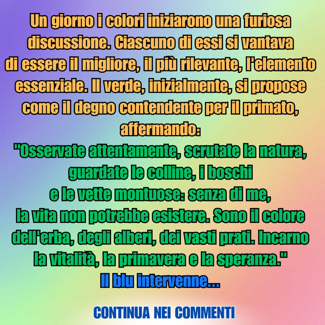 Un giorno i colori iniziarono una furiosa discussione. Ciascuno di essi si vantava di essere il migliore… Continua24 Dicembre 202324 Dicembre 2023di taniaPAROLE IN GIOCO