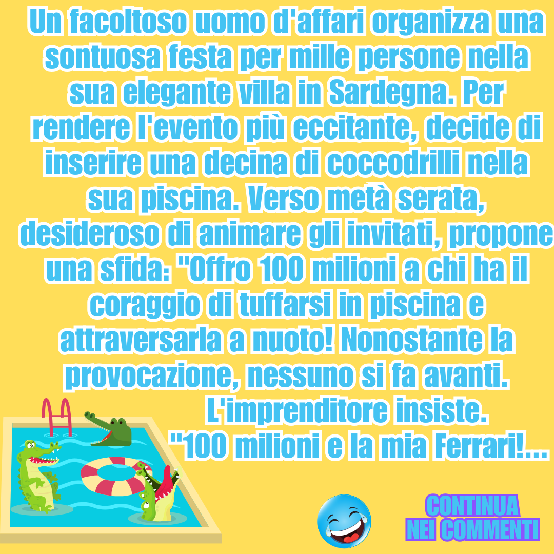 Un facoltoso uomo d’affari organizza una sontuosa festa. Per rendere l’evento più eccitante, decide di inserire una decina di coccodrilli nella sua piscina…18 Gennaio 202418 Gennaio 2024di taniaPAROLE IN GIOCO