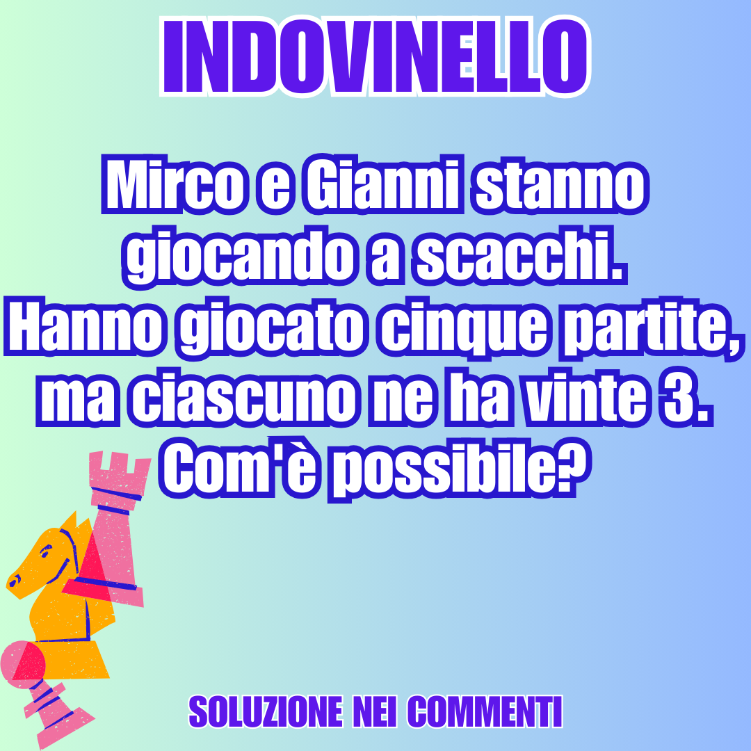 Indovinello: Mirco e Gianni stanno giocando a scacchi. Hanno giocato cinque partite, ma ciascuno ne ha vinte 3. Com’è possibile?7 Gennaio 20247 Gennaio 2024di taniaPAROLE IN GIOCO