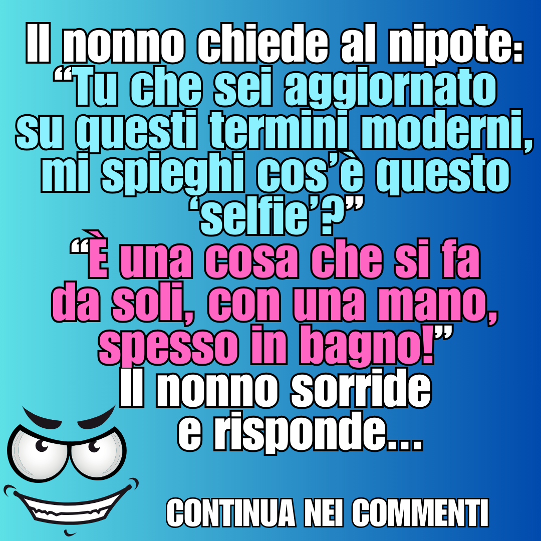 Il nonno chiede al nipote: “Tu che sei aggiornato su questi termini moderni, mi spieghi cos’è questo ‘selfie’?”2 Gennaio 20242 Gennaio 2024di taniaPAROLE IN GIOCO