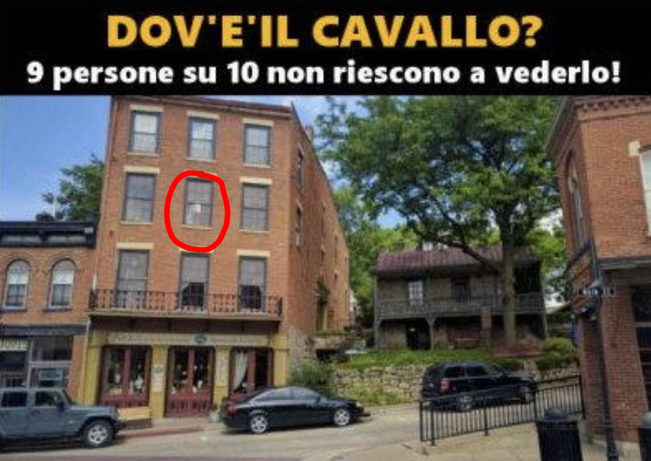 A complicare estremamente questo test visivo non è solo il fatto che un cavallo in un paesaggio cittadino è insolito, ma anche la sua stessa posizione non è affatto comune. Questo non consente al cervello di focalizzarsi sulla parte di immagine utile a stanare l’animale.