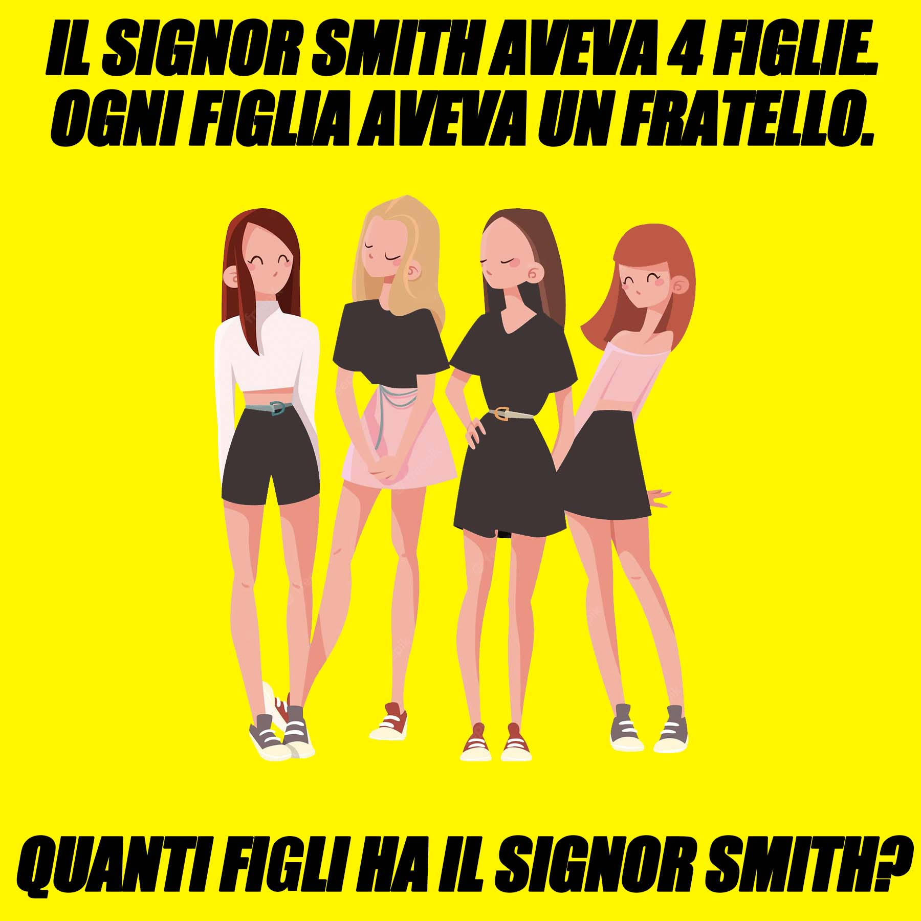 Il signor Smith aveva 4 figlie. Ogni figlia aveva un fratello. Quanti figli ha il signor Smith?16 Gennaio 202316 Gennaio 2023di davidPAROLE IN GIOCO