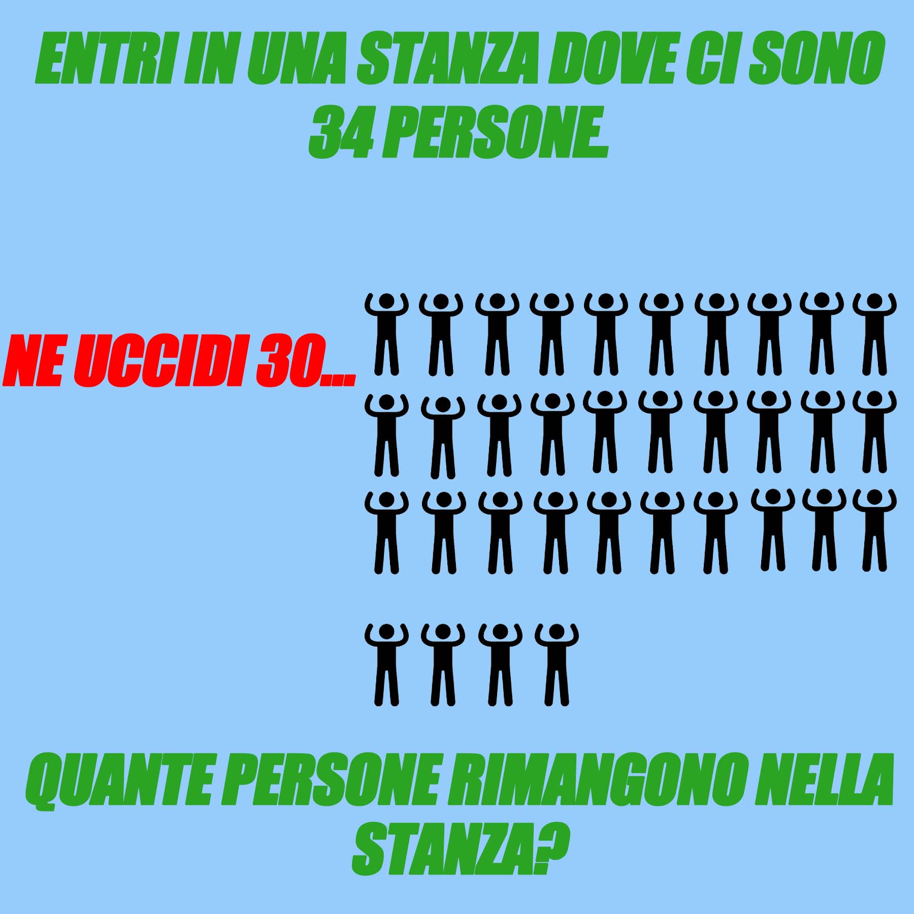 Entri in una stanza dove ci sono 34 persone. Ne uccidi 30. Quante persone rimangono nella stanza?16 Gennaio 202316 Gennaio 2023di davidPAROLE IN GIOCO