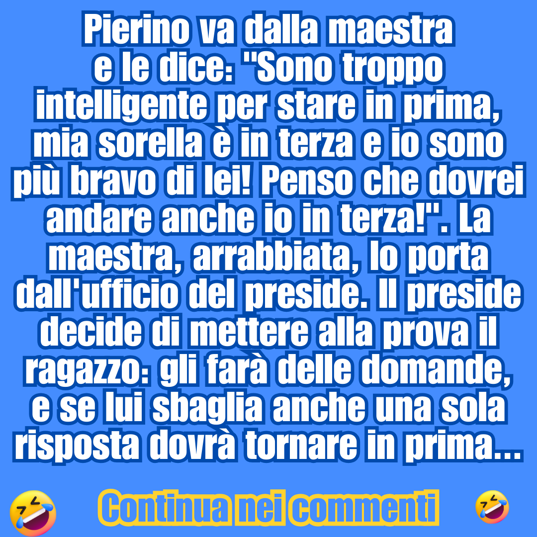 Pierino va dalla maestra e le dice: “Sono troppo intelligente per stare in prima, mia sorella è in terza e io sono più bravo di lei!”… Continua29 Dicembre 202329 Dicembre 2023di taniaPAROLE IN GIOCO