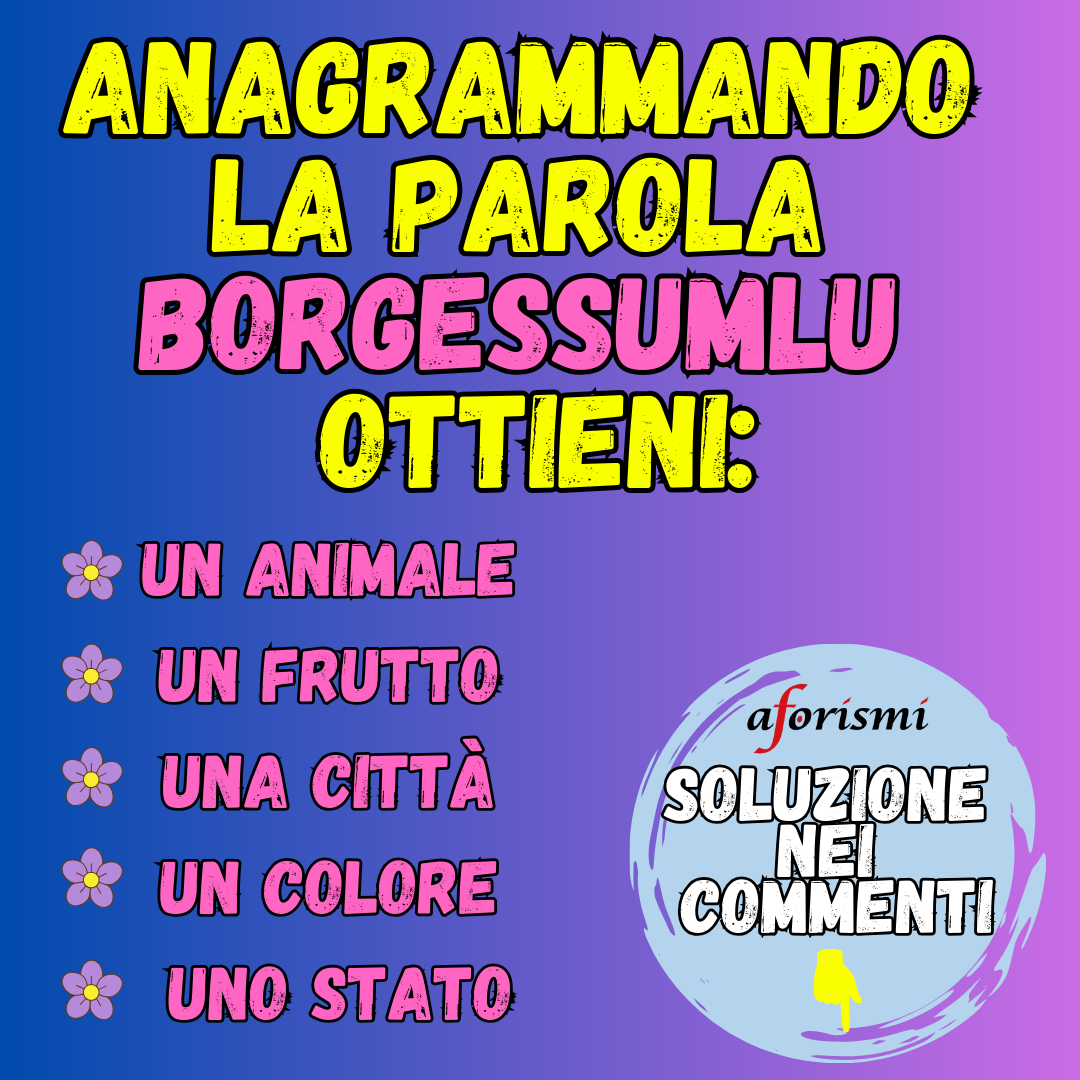 Anagrammando la parola BORGESSUMLU, riuscite a trovare un animale, un frutto, una città, un colore o uno stato?29 Marzo 202529 Marzo 2025di Aforismi.itPAROLE IN GIOCO