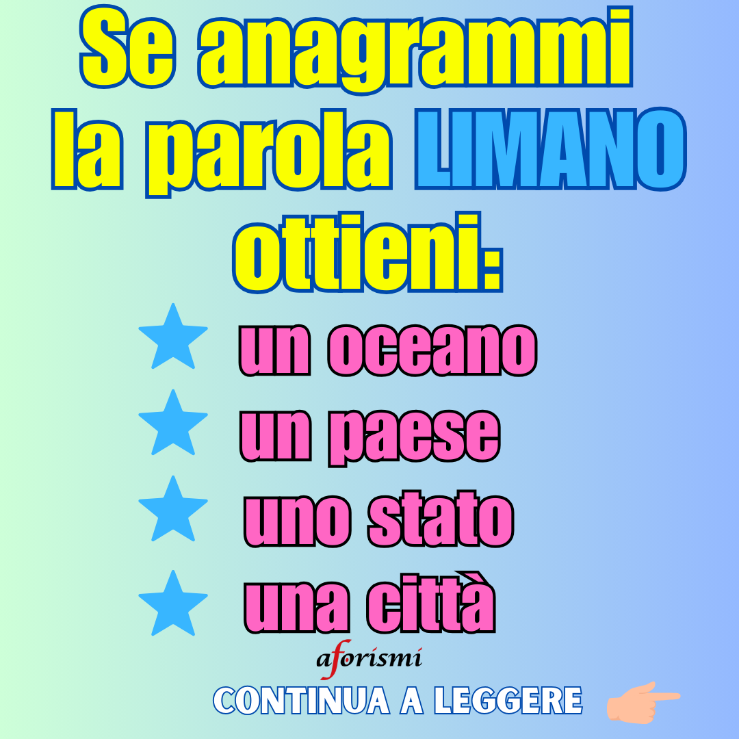 Se anagrammi la parola LIMANO ottieni un oceano, un paese, uno stato, una città?26 Marzo 2025di Aforismi.itPAROLE IN GIOCO