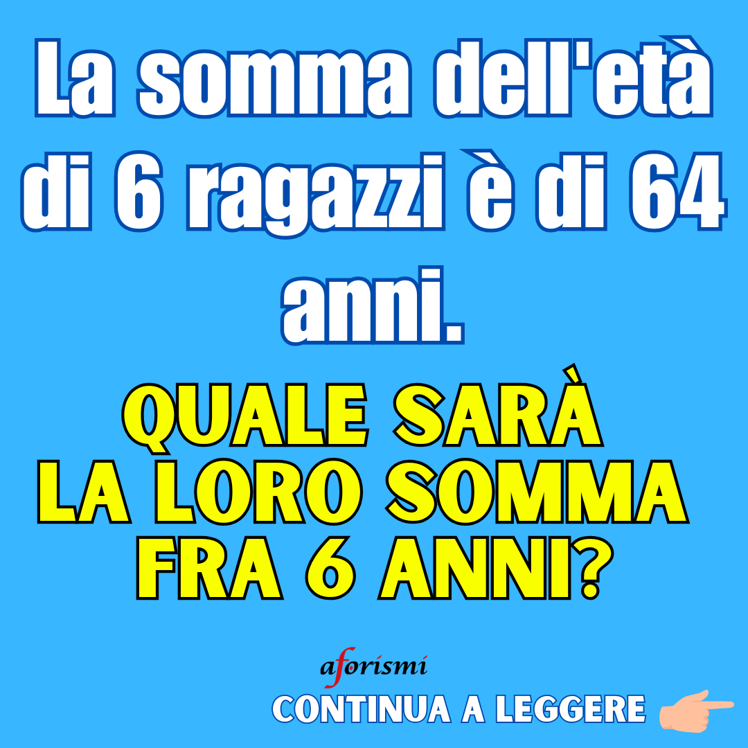 La somma dell’età di 6 ragazzi è di 64 anni. Quale sarà la loro somma fra 6 anni?25 Marzo 202525 Marzo 2025di Aforismi.itPAROLE IN GIOCO