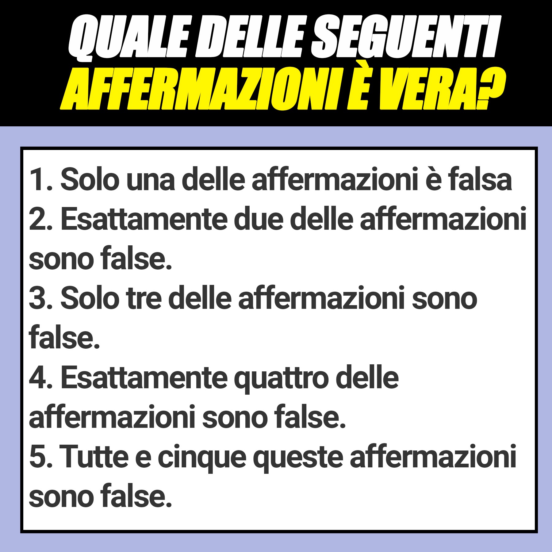 Qual è l’affermazione vera? Tutte le altre sono false!12 Agosto 202212 Agosto 2022di davidPAROLE IN GIOCO