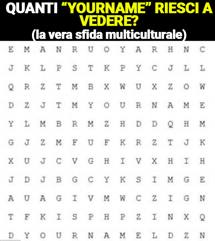 Quanti “your name” riesci a trovare in questa griglia di parole? Metti alla prova le tue abilità per risolvere questo enigma16 Dicembre 202116 Dicembre 2021di davidPAROLE IN GIOCO