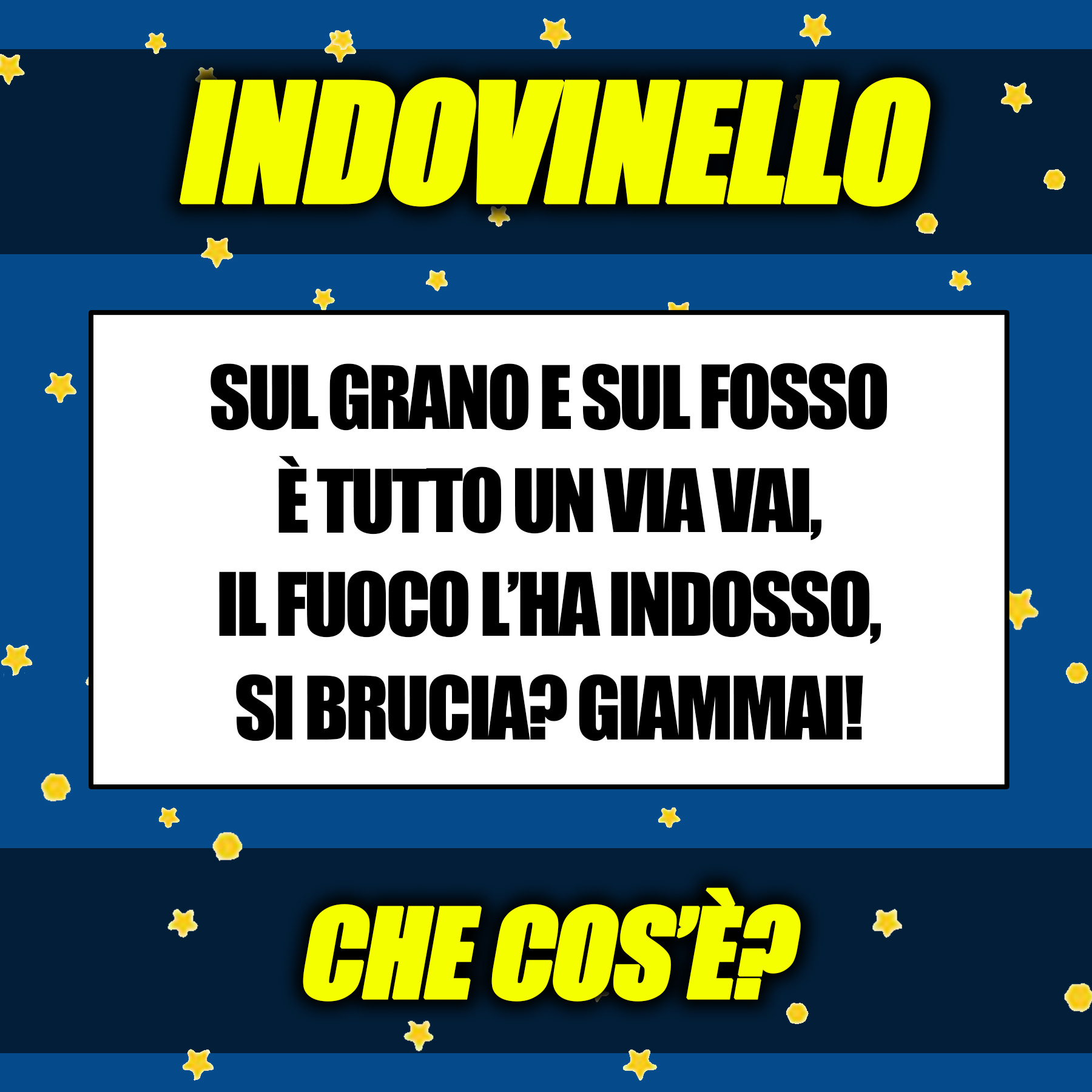 Sul grano e sul fosso è tutto un via vai, il fuoco l’ha indosso, si brucia? Giammai! Che cos’è?30 Giugno 202330 Giugno 2023di davidPAROLE IN GIOCO