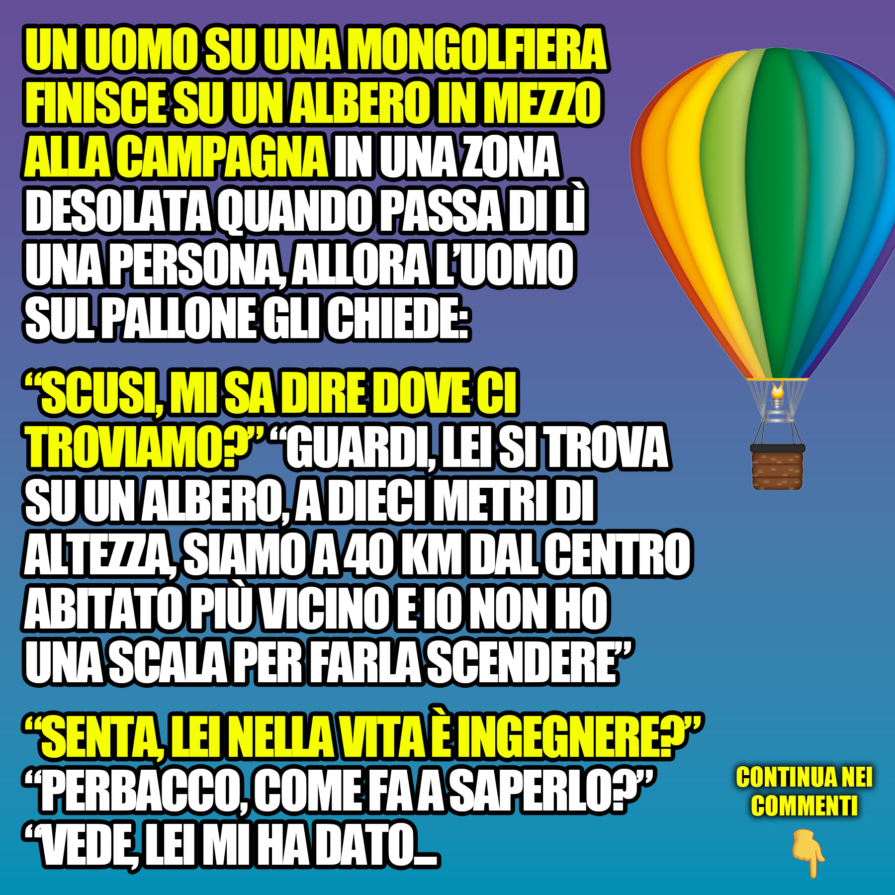 Un uomo su una mongolfiera finisce su un albero in mezzo alla campagna in una zona desolata quando passa di lì una persona, allora…30 Giugno 202330 Giugno 2023di davidPAROLE IN GIOCO