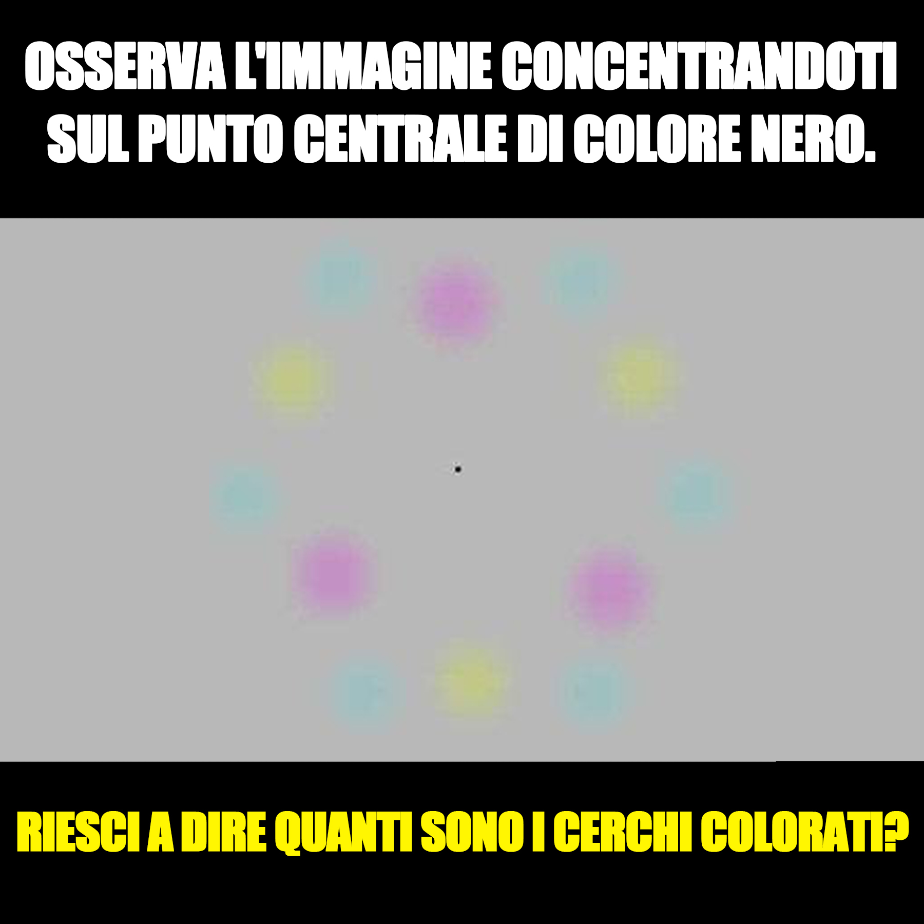 Osserva l’immagine concentrandoti sul punto centrale di colore nero. Riesci a dire quanti sono i cerchi colorati?16 Giugno 202311 Settembre 2025di davidPAROLE IN GIOCO