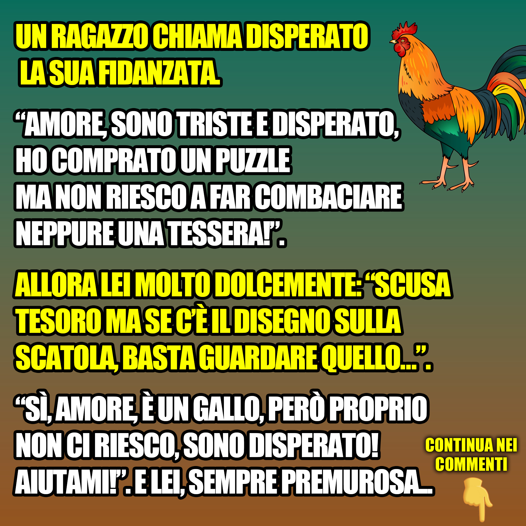 Un ragazzo chiama disperato la sua fidanzata.“Amore, sono triste e disperato, ho comprato un puzzle ma non riesco…16 Giugno 202316 Giugno 2023di davidPAROLE IN GIOCO