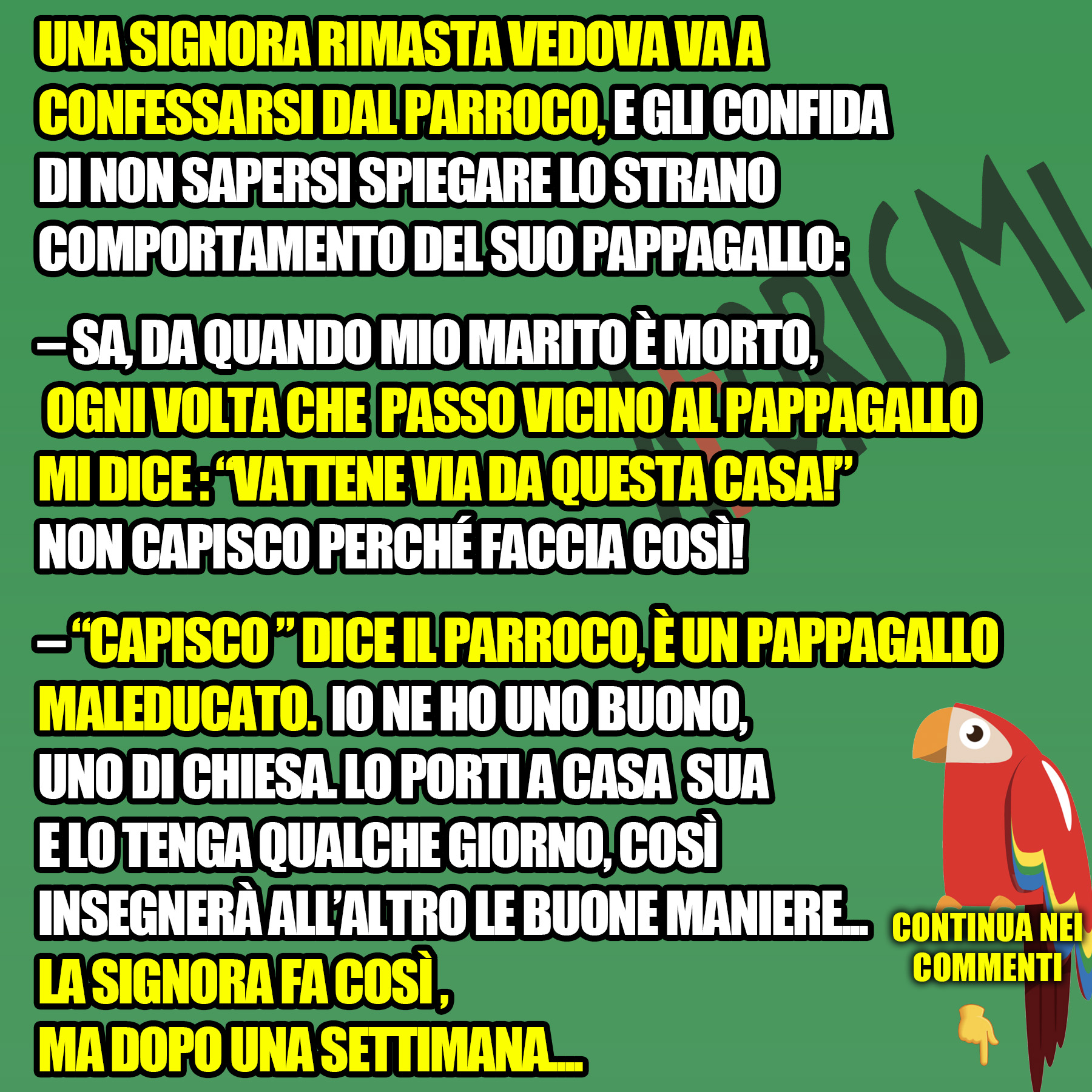 Una signora rimasta vedova va a confessarsi dal parroco, e gli confida di non sapersi spiegare lo strano comportamento del suo pappagallo…30 Maggio 202311 Settembre 2025di davidPAROLE IN GIOCO