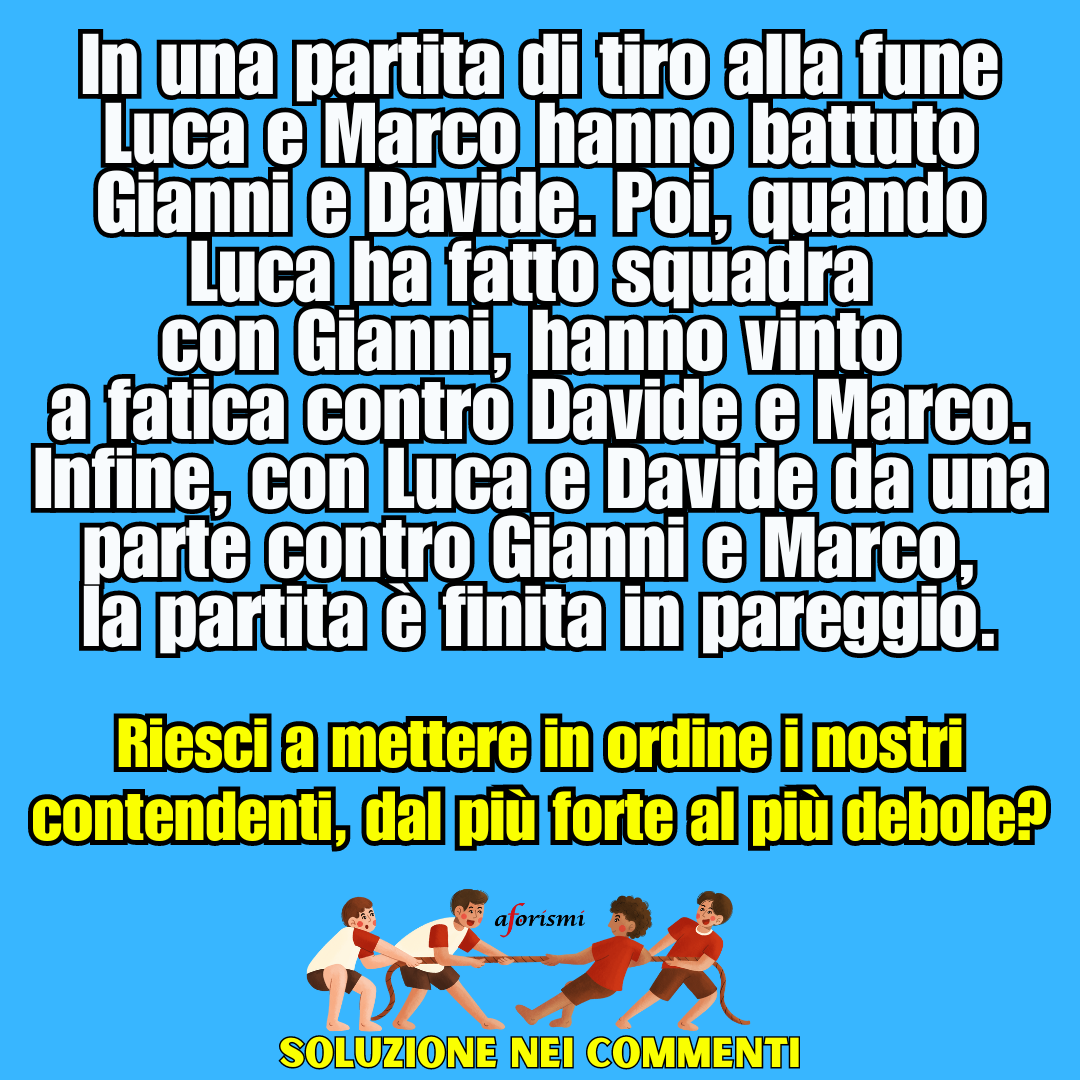 Chi è il più forte? Sfida la tua logica con il nostro enigma del tiro alla fune!27 Settembre 202427 Settembre 2024di Aforismi.itPAROLE IN GIOCO