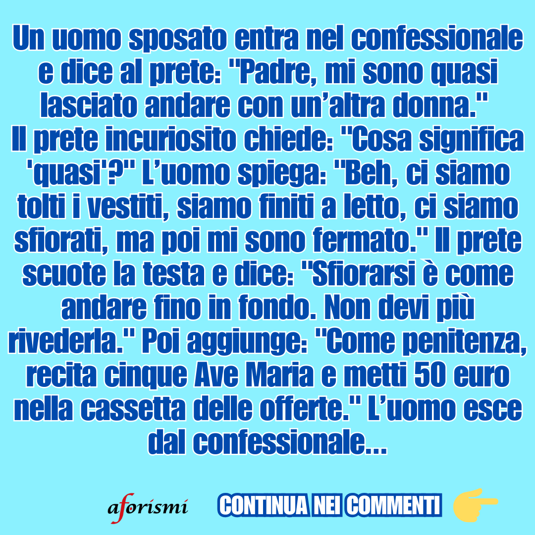 Un uomo sposato entra nel confessionale e dice al prete: “Padre, mi sono quasi lasciato andare con un’altra donna. “Il prete incuriosito chiede: “Cosa significa ‘quasi’?”17 Ottobre 202417 Ottobre 2024di Aforismi.itPAROLE IN GIOCO