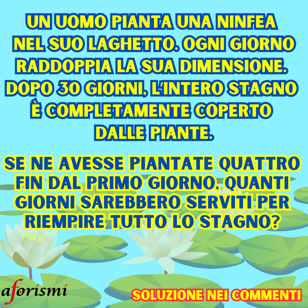 Un uomo pianta una ninfea nel suo laghetto. Ogni giorno raddoppia la sua dimensione…8 Ottobre 20248 Ottobre 2024di Aforismi.itPAROLE IN GIOCO
