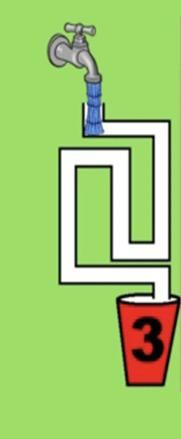 Per risolvere questa tipologia di enigmi occorre considerare sempre tenere a mente che la forza di gravità ha un ruolo di primaria importanza. Partiamo con il concentrare la nostra attenzione sul primo bicchiere, l’acqua in questo caso scenderà molto velocemente in quanto il percorso risulta essere tutto in discesa. Per i restanti tre bicchieri sarà necessario per l’acqua fare delle parti di percorso, per così dire “contro mano”.