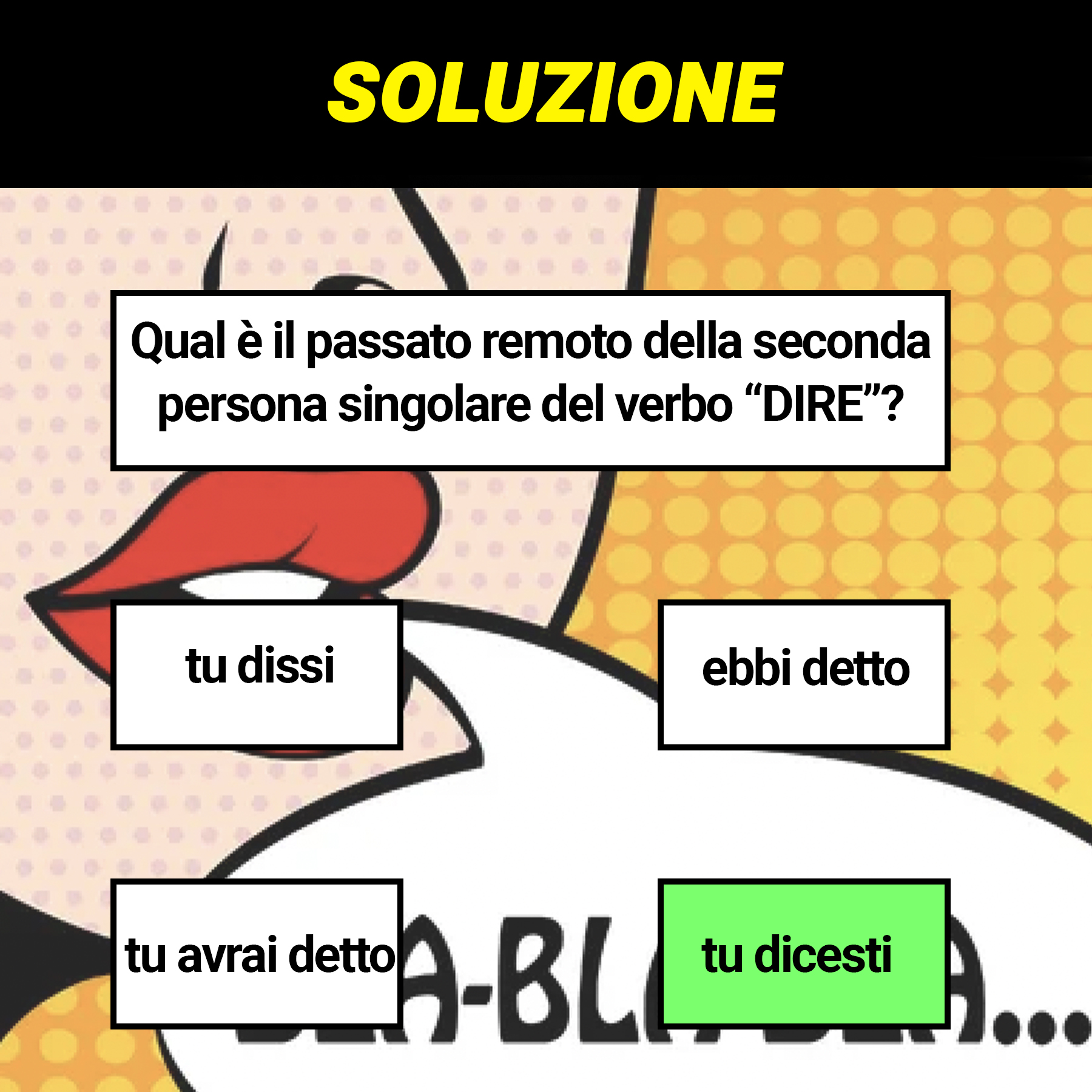 Ma torniamo al nostro quiz. Sapete tutti che la seconda persona singolare è “tu”? Arrivati a questo punto vi suggeriamo di eliminare dalla competizione le forme composte, ovvero quelle che si servono dell’ausiliare verbo avere: “tu avrai detto” e “ebbi detto” in quanto sono rispettivamente futuro anteriore e trapassato remoto. Restano solamente due opzioni scegline una e verifica se la tua risposta è corretta guardando la soluzione.