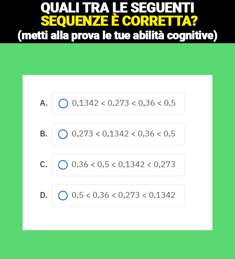 Per agevolarvi nell’impresa prendiamo in considerazione la risposta D: 0,5 < 0,36 < 0,273 < 0,1342. Questa risposta è di certo sbagliata. 0,5 infatti è maggiore di 0,36 perché corrisponde a 50 centesimi. Se avete capito qual è il procedimento giusto per arrivare alla soluzione non vi resta che farne buon uso ed arrivare alla soluzione.