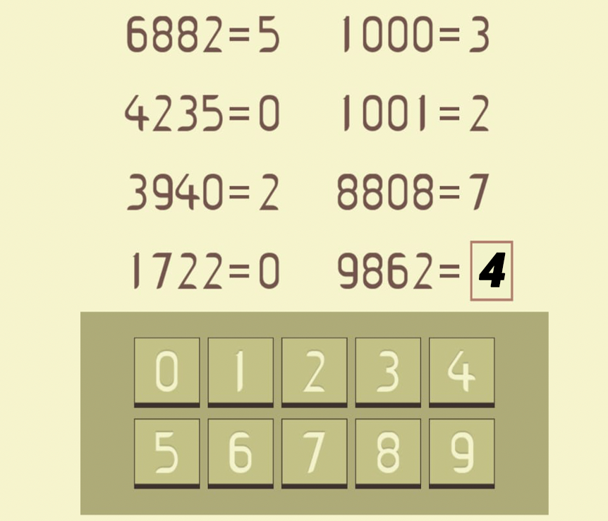 Come potete vedere nella la tastiera posizionata in basso al rompicapo ci sono tutti i numeri che potete inserire all’interno del rettangolo rosso, vanno da 0 a 9. Prima di provare ad indovinare vi suggeriamo di fare attenzione a tutte quelle equazioni di cui conosciamo il risultato, per tentare di capire quale logica si nasconde dietro questo simpatico test.
