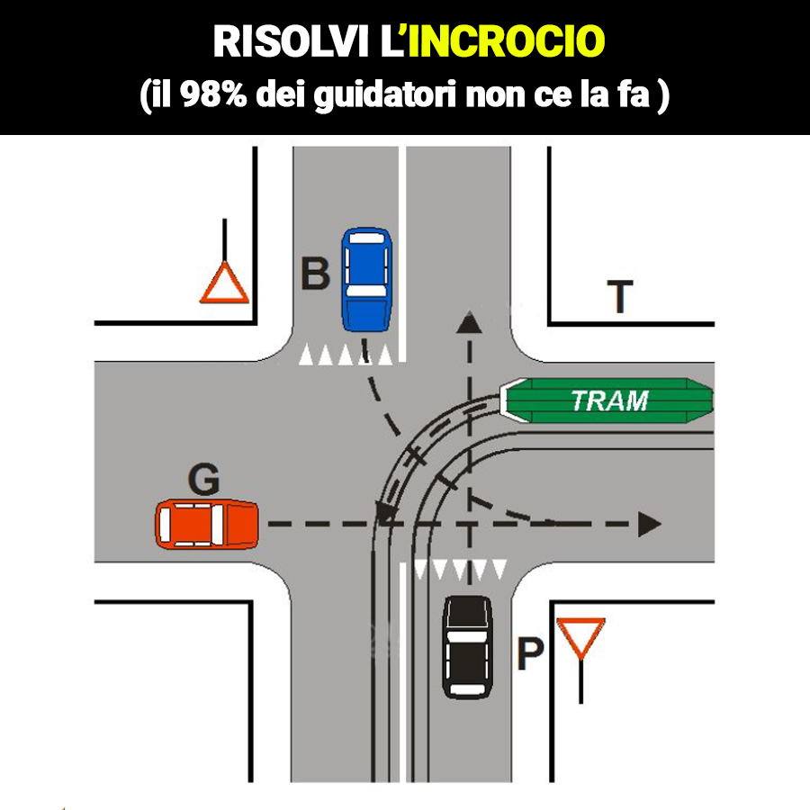 Capovolgendo l’immagine possiamo notare più chiaramente come, dopo il passaggio del tram, solo una delle macchine possa realmente liberare l’incrocio. Ma, se arrivati a questo punto, non siete ancora riusciti a capire come risolvere questo incrocio vi sveliamo la soluzione.