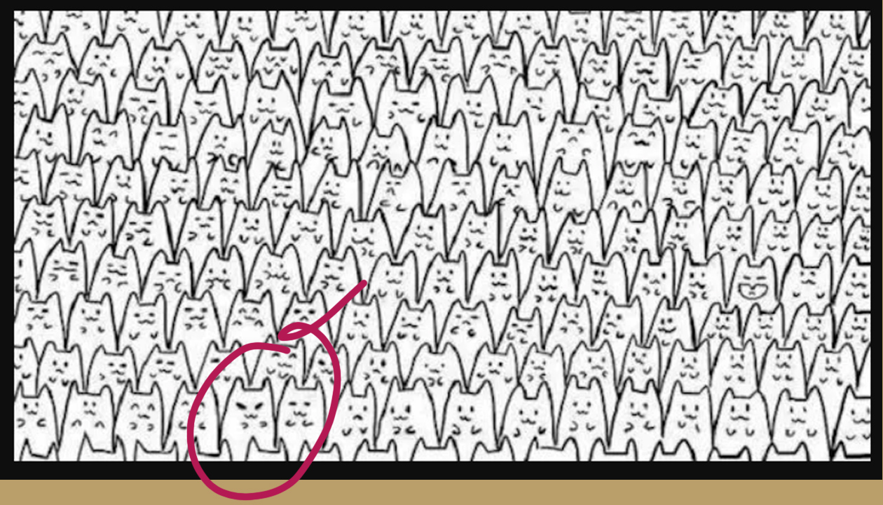 Se non avete ancora trovato il gattino forse avete bisogno di un indizio, provate a guardate in basso a sinistra. Ancora niente? Se ancora non avete visto il gatto arrabbiato e siete ormai diventati curiosi di sapere dove si trova. Scoprite la soluzione qui sotto.