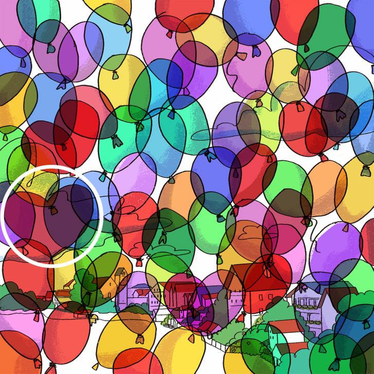 Come potete vedere questa immagine rappresenta un gruppo di palloncini che stanno prendendo il volo, da una tranquilla e pulita cittadina. Tinti dei colori più belli, modificano la visuale dello spettatore, impedendogli di cogliere i dettagli più nascosti dell’immagine. Riesci a vedere il palloncino a forma di cuore?