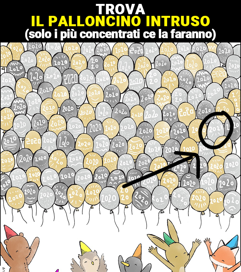 L’immagine di oggi è ambientata durante una festa che sembrerebbe festeggiare il primo dell’anno 2020. Tuttavia uno dei personaggi presenti ci ha probabilmente visto lungo ed ha pensato di lanciare andare un palloncino con la reale data attuale, 2021. Riesci a trovare questo palloncino alternativo?