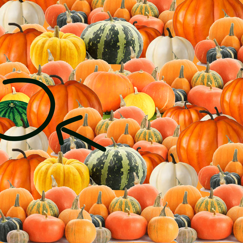 Eccoci tornati con un altro quiz inedito prodotto dalla nostra redazione a tema Halloween. La festa è sempre più vicina e tante persona si stanno dilettando per creare le zucche più spaventose e più belle. In questa immagine piena di zucche se ne distingue una che tuttavia non è propriamente una zucca. Sappiamo bene che in natura questo ortaggio può mostrarsi in varie forme e colori, tuttavia in questa immagine c’è una zucca che in realtà è un frutto: un’anguria. Riuscite a vederla?