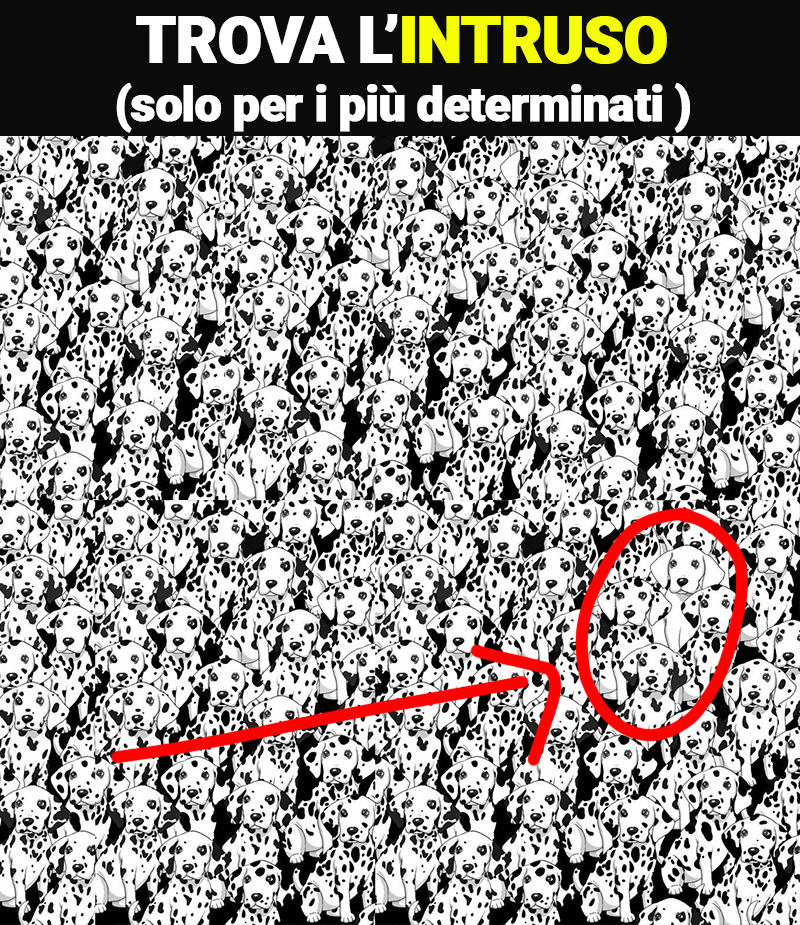 Bentornati sulla nostra pagina, dove tutti i giorni trovate quiz nuovi di zecca per poter mettere in gioco le vostre abilità visive e condividere con i vostri amici e parenti deliziosi test, creati ad hoc per far scervellare i più accaniti osservatori. L’immagine di oggi ricorda un po’ il famoso film Disney ” La carica dei 101″, una marea di cagnolini dalmata ha invaso lo schermo. Riesci a vedere l’intruso?