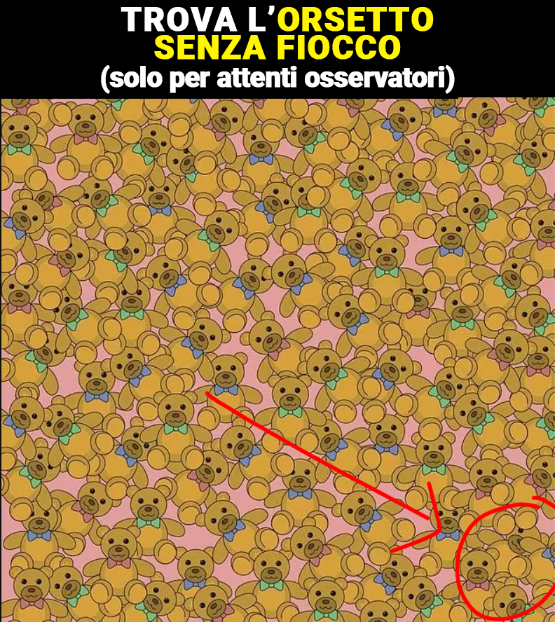 Bentornati su Aforismi.it, il vostro sito di fiducia per quando riguarda il tenere allenato il vostro cervello. Quello che vi presentiamo oggi è un test visivo degno del vostro interesse. L’immagine in questione rappresenta un gruppo di orsetti dotati di fiocchetti di diverso colore. Riesci a trovare l’orsetto senza fiocco?