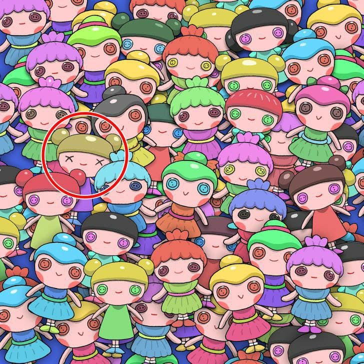 Bentornati sulla nostra pagina, dove tutti i giorni trovate quiz nuovi di zecca per poter mettere in gioco le vostre abilità visive e condividere con i vostri amici e parenti deliziosi test, creati ad hoc per far scervellare i più accaniti osservatori. L’immagine di oggi è composta da un gran mucchio di bambole tutte simili tra loro. Tuttavia una di queste è diversa dalle altre. Riuscite a vedere quale?
