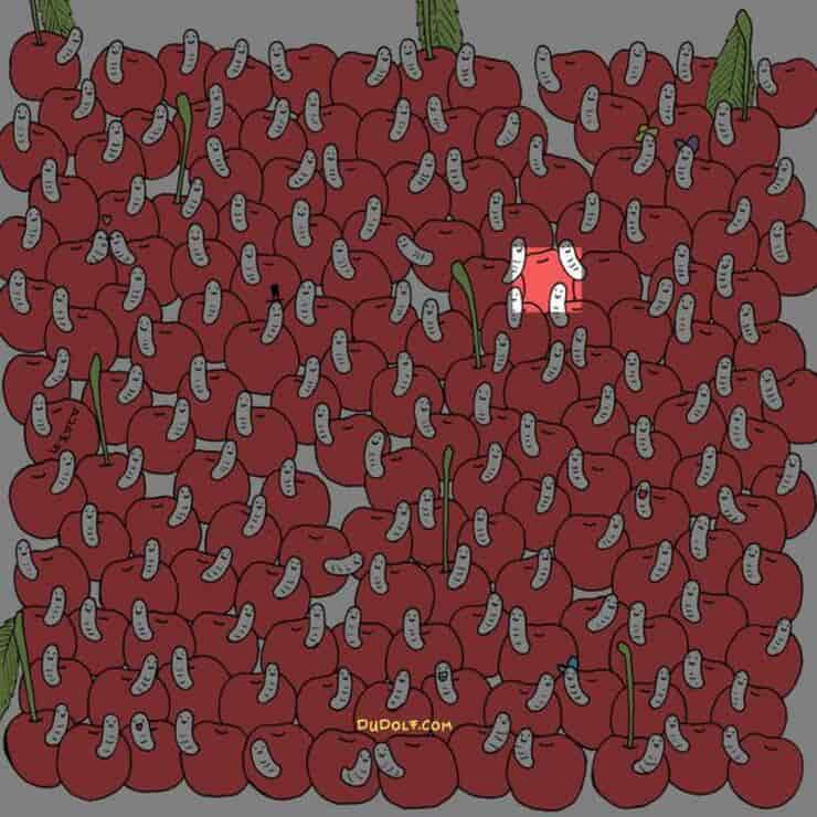 Eccoci tornati con un nuovo test, selezionato accuratamente selezionato dalla nostra redazione all’interno del mare infinito del web. L’immagine di oggi rappresenta, per gli aanti della frutta, un vero dispiacere; un mare di ciliegie bacate, con lombrichi di qualsiasi tipo. Tuttavia, fortunatamente, una ciliegia e solo una, è rimasta sana e salva e aspetta solo di essere mangiata. Riesci a trovarla?
