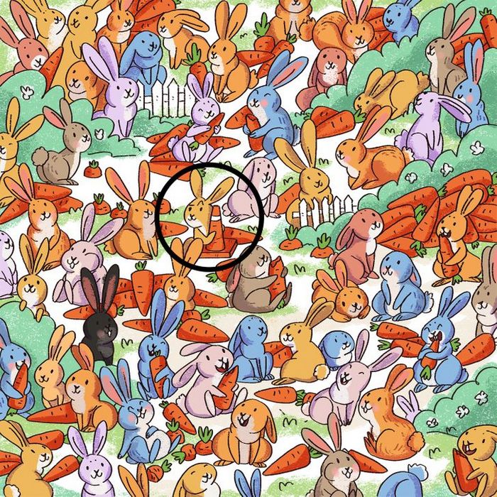 Staccionate, fiorellini ed altri elementi sono inseriti in questa immagine proprio per destare confusione nello spettatore. Dunque non lasciatevi ingannare e concentratevi su tutti gli elementi di colore arancio, presenti nell’immagine. Per agevolarvi nell’impresa vi mostriamo qui in seguito la stessa immagine leggermente ingrandita. Riuscite ad individuare il coniglio che ha commesso l’errore?