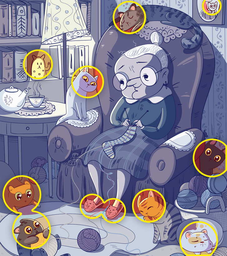 Una tenera nonnina se ne sta seduta sulla sua poltrona a lavorare la lani, circondata dai suoi amici felini che le tengono compagnia. Oltre ai numerosi gattini che vivono con lei è piena di gadget e accessori per la casa che rappresentano questi animaletti nella più svariate forme. Prestategli attenzione e riuscirete in questa sfida.