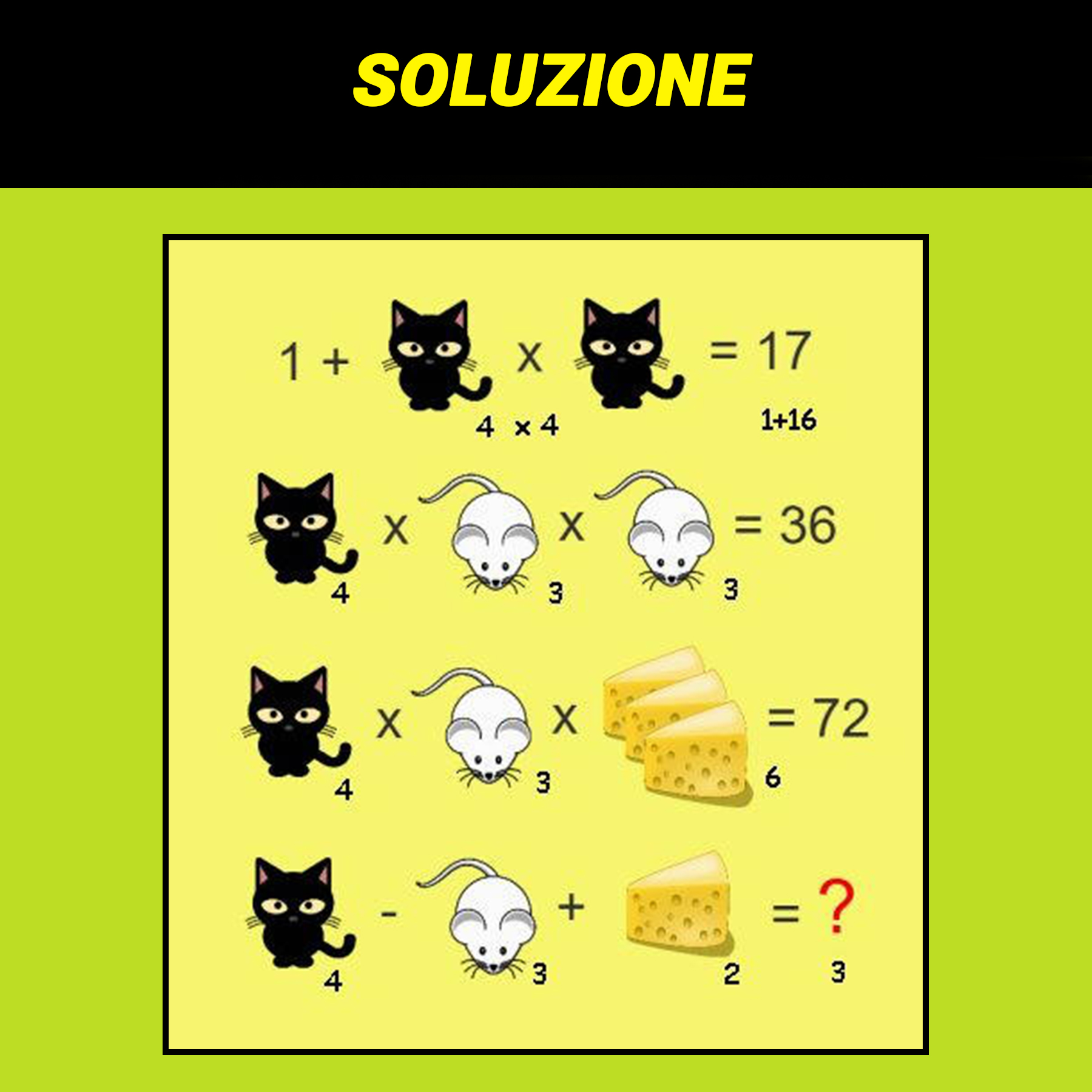 In merito alla seconda equazione possiamo procedere più semplicemente facendo dei tentativi. Qual’è quel numero che moltiplicato per se stesso e poi per 4 da come risultato 36? Certamente stiamo parlando del numero 3. Infatti 4 x 3 x 3 = 36. Non ci resta che scoprire il valore dei tre pezzi di formaggio. 4 x 3 x ? = 72. La penultima equazione potrebbe darvi un po’ di filo da torcere ma per i più attenti sarà scontato scoprire che i tre pezzi di formaggio valgono 6. Quale il risultato dell’ultima equazione? Date un’occhiata alla soluzione per scoprirlo.
