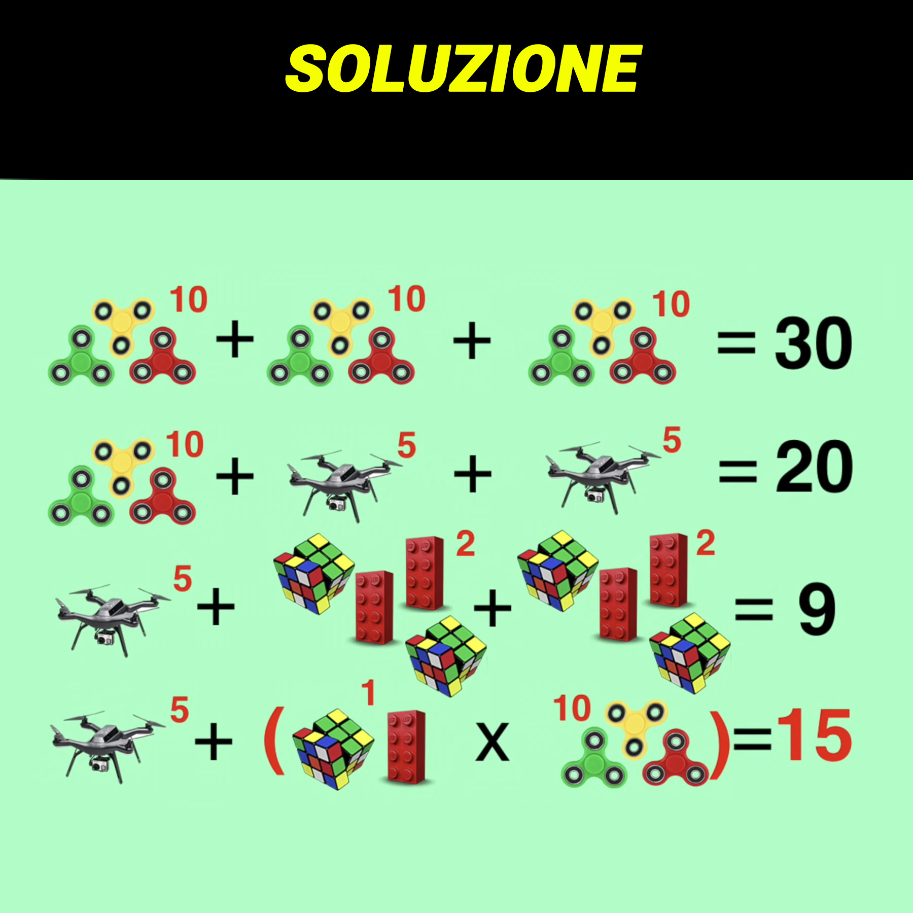 La prima equazione è molto semplice da decifrare, quando la somma di tre elementi uguali ha un valore, basterà dividere quel valore per il numero di elementi (30:3=10). Ora sappiamo che il primo elemento della seconda equazione vale 10. Come la risolvereste? Ve lo diciamo noi (20 -10: 2= 5). Ogni aeroplano vale 5 unità.