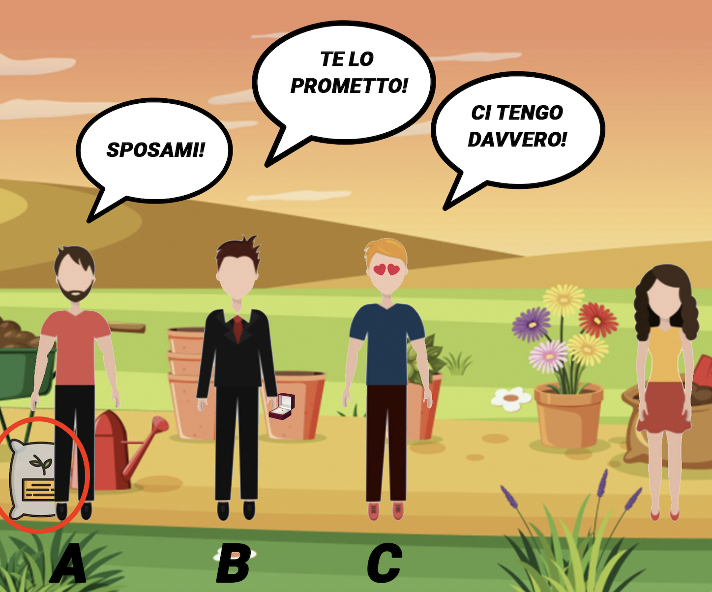Bentornati su Aforismi.it, come state? Se quella che stavate aspettando è un sfida logico-cognitiva siete nel posto giusto. Quiz come quello che vi stiamo per mostrare sarà utile alla vostra materia grigia per tenersi in forma e mantenersi allenata. Guardiamolo insieme, tre uomini stanno facendo la corte ad una splendida ragazza amante della natura. Riesci a dire chi tra i tre sarebbe più adatto per lei?