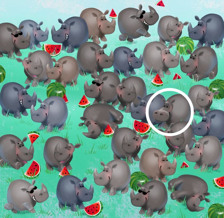 Una nuova sfida visiva sta solo aspettando di essere risolta. Sei un attento osservatore? Dimostra ai tuoi amici di essere la tua capacità di notare i dettagli e non lasciarti sfuggire nulla. Un rinoceronte sta passando del tempo in piacevole compagnia dei suoi simili, sorseggiando del succo di cocomero con tanto di occhiali da sole. Tuttavia all’interno di questo paradiso per animali c’è un ippopotamo cerca di passare inosservato. Riesci a vedere dove si trova?