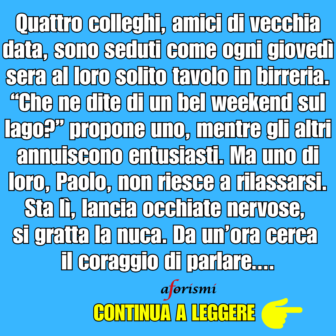 Quattro colleghi sono seduti al tavolo in birreria. “Che ne dite di un bel weekend sul lago?” propone uno… (CONTINUA)15 Aprile 202515 Aprile 2025di Aforismi.itSOCIETÀ