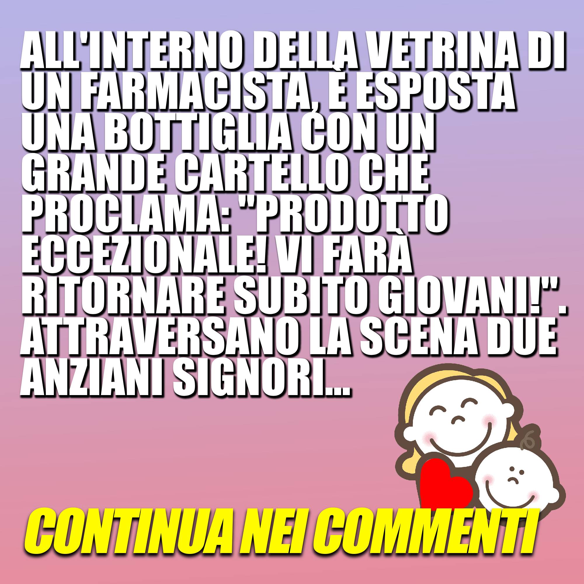 All’interno della vetrina di un farmacista, è esposta una bottiglia con un grande cartello che proclama: “Prodotto eccezionale! Vi farà ritornare subito giovani!” Continua20 Novembre 202320 Novembre 2023di davidSOCIETÀ