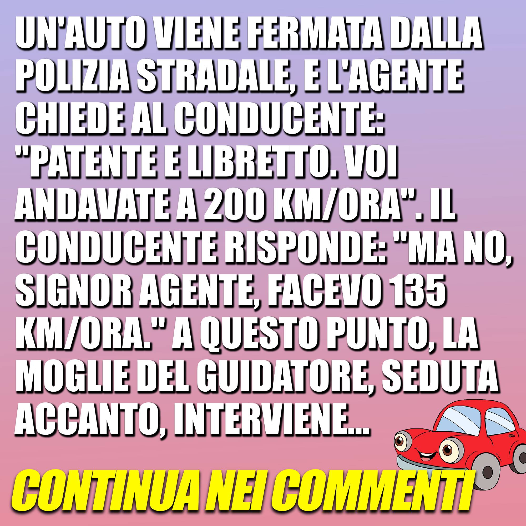 Un’auto viene fermata dalla polizia stradale, e l’agente chiede al conducente: “Patente e libretto. Voi andavate a 200 Km/ora”. Il conducente risponde: “Ma no, signor agente, facevo 135 Km/ora.” A questo punto, la moglie del guidatore, seduta accanto, interviene… Continua7 Novembre 20237 Novembre 2023di davidSOCIETÀ