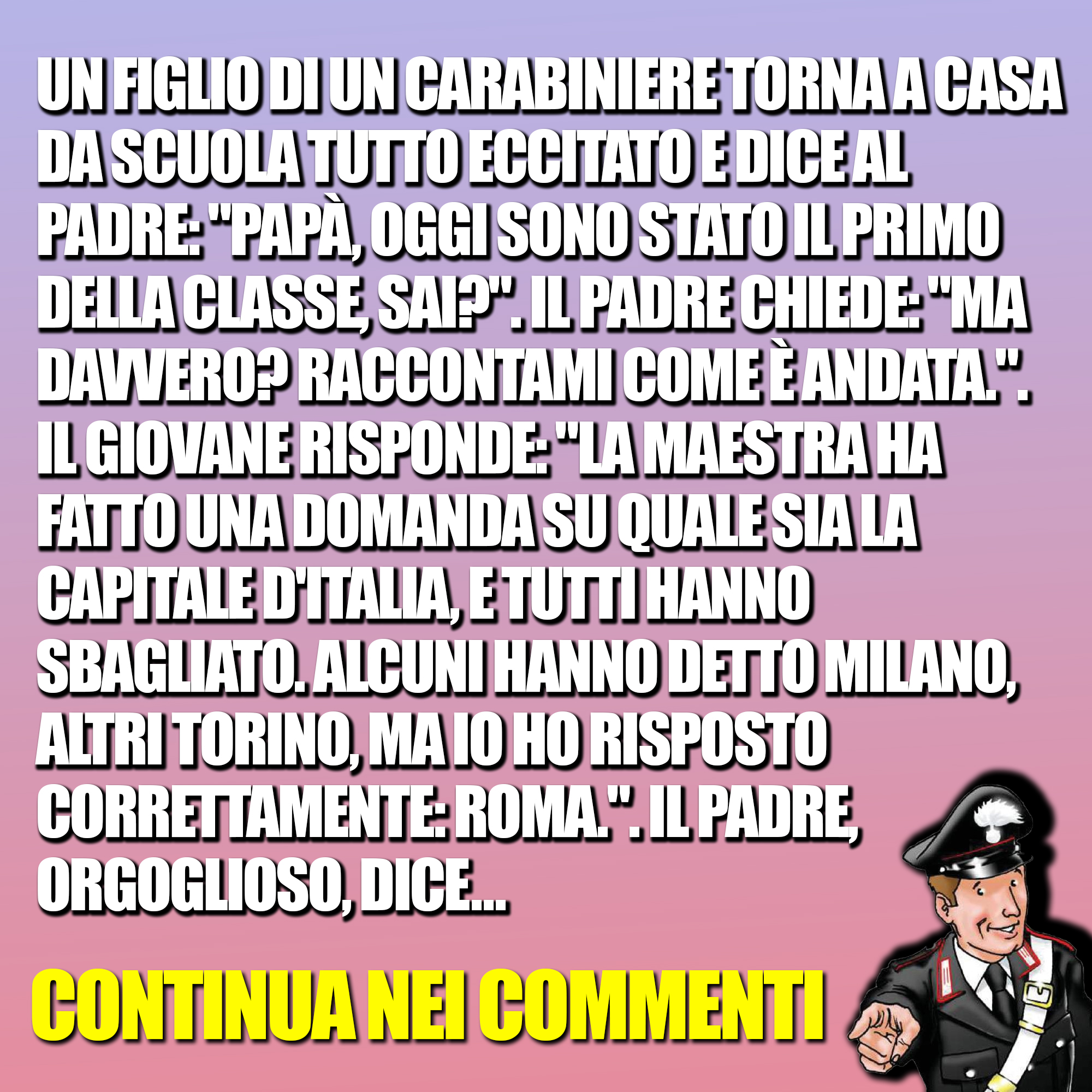 Un figlio di un carabiniere torna a casa da scuola tutto eccitato e dice al padre: “Papà, oggi sono stato il primo della classe, sai?”. Il padre chiede: “Ma davvero? Raccontami…” Continua10 Ottobre 202310 Ottobre 2023di davidSOCIETÀ