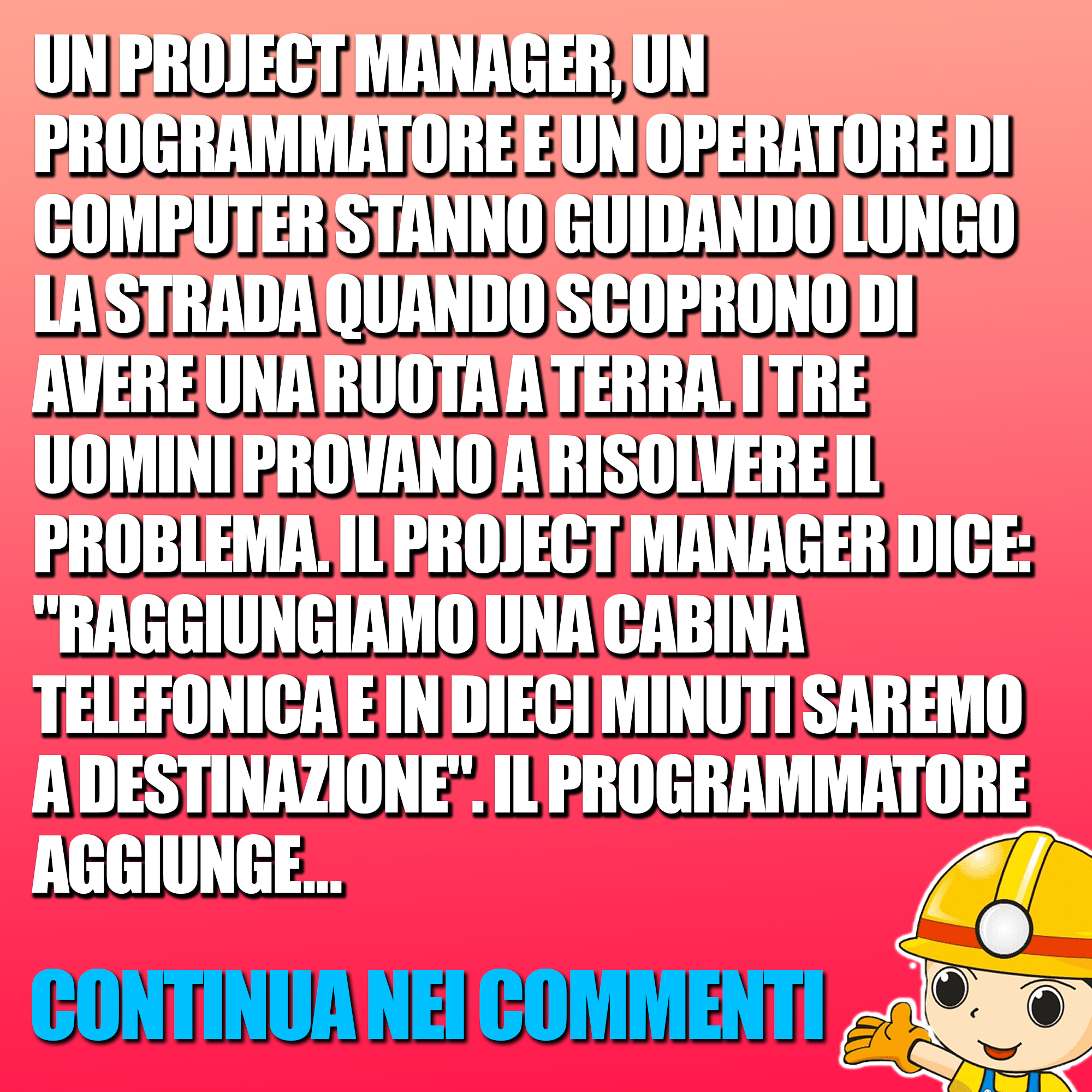 Un project manager, un programmatore e un operatore di computer stanno guidando lungo la strada quando scoprono di avere una ruota a terra… Continua10 Ottobre 202310 Ottobre 2023di davidSOCIETÀ