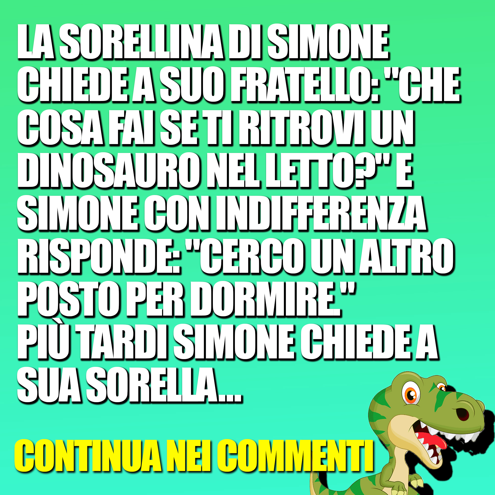 La sorellina di Simone chiede a suo fratello: “Che cosa fai se ti ritrovi un dinosauro nel letto?” E Simone con indifferenza risponde… Continua3 Ottobre 2023di davidSOCIETÀ