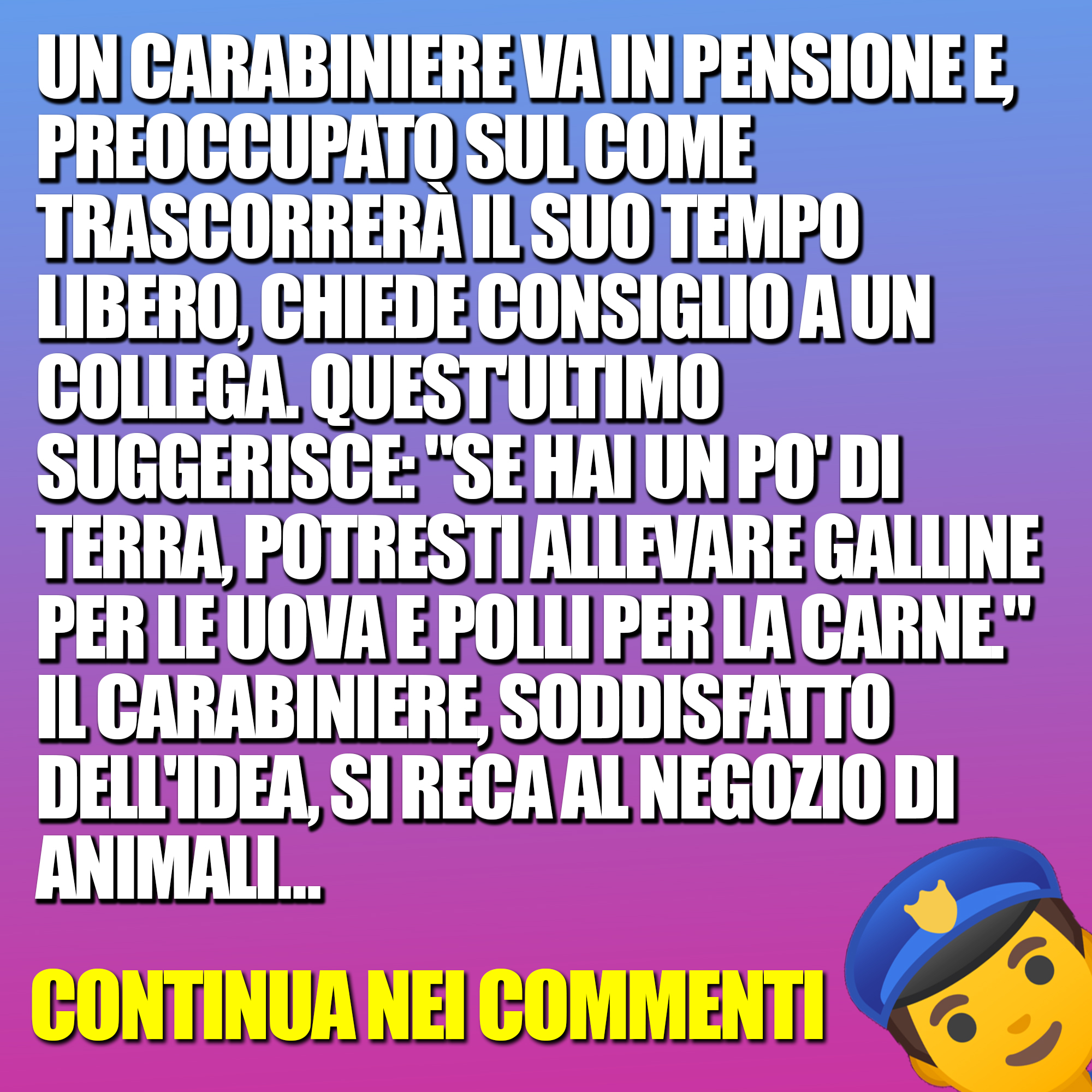 Un carabiniere va in pensione e, preoccupato sul come trascorrerà il suo tempo libero, chiede consiglio a un collega. Quest’ultimo suggerisce… Continua27 Settembre 202328 Settembre 2023di davidSOCIETÀ