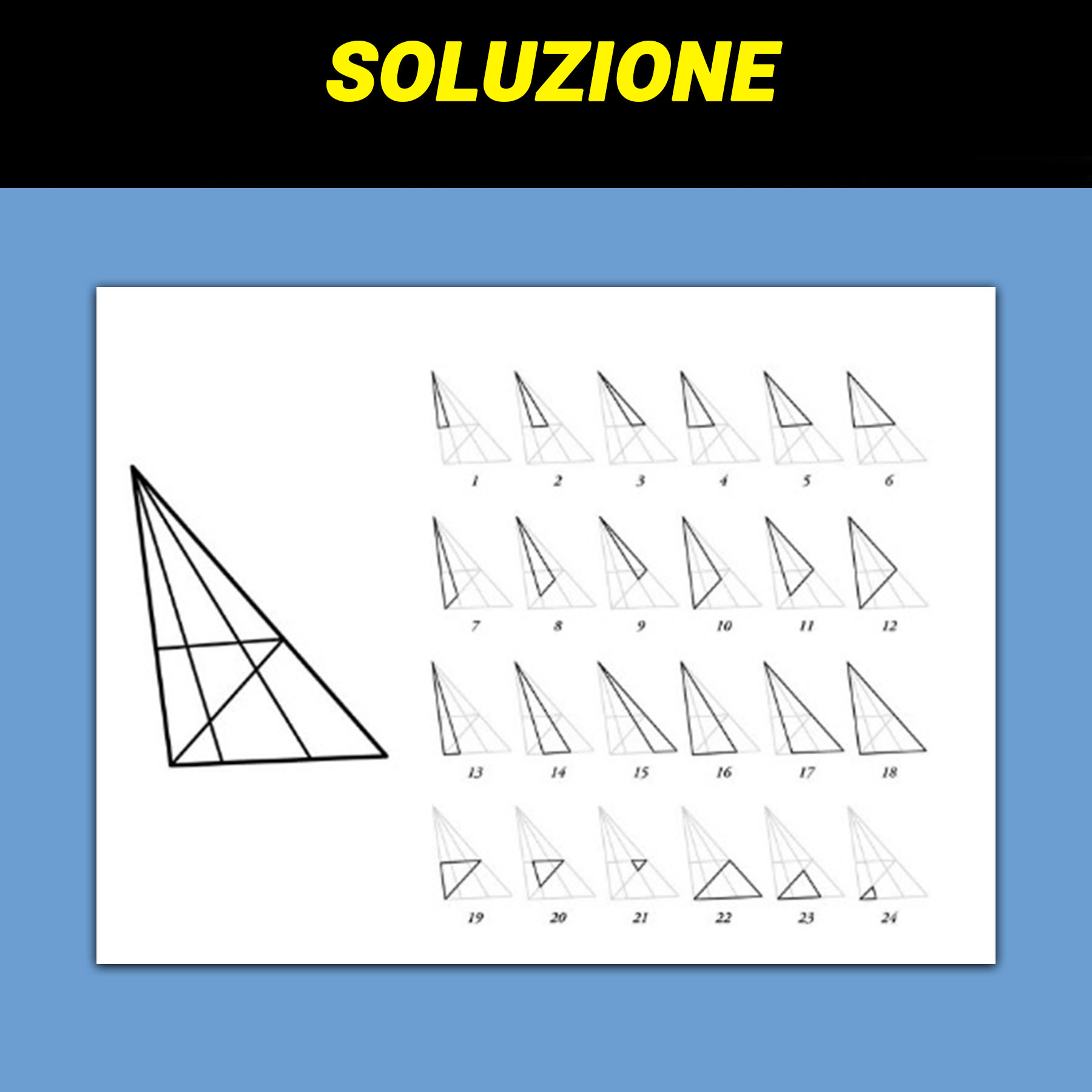 Ciò che vi consigliamo è di procedere in maniera schematica: ovvero partendo dai triangoli di più piccole dimensioni che riuscite a vedere, fino al più grande o viceversa. Diamo per scontato che abbiate già contato i più piccoli ed il più grande di conseguenza maggiori difficoltà creano per gli spettatori i triangoli di medie dimensioni, facciamo un esempio.