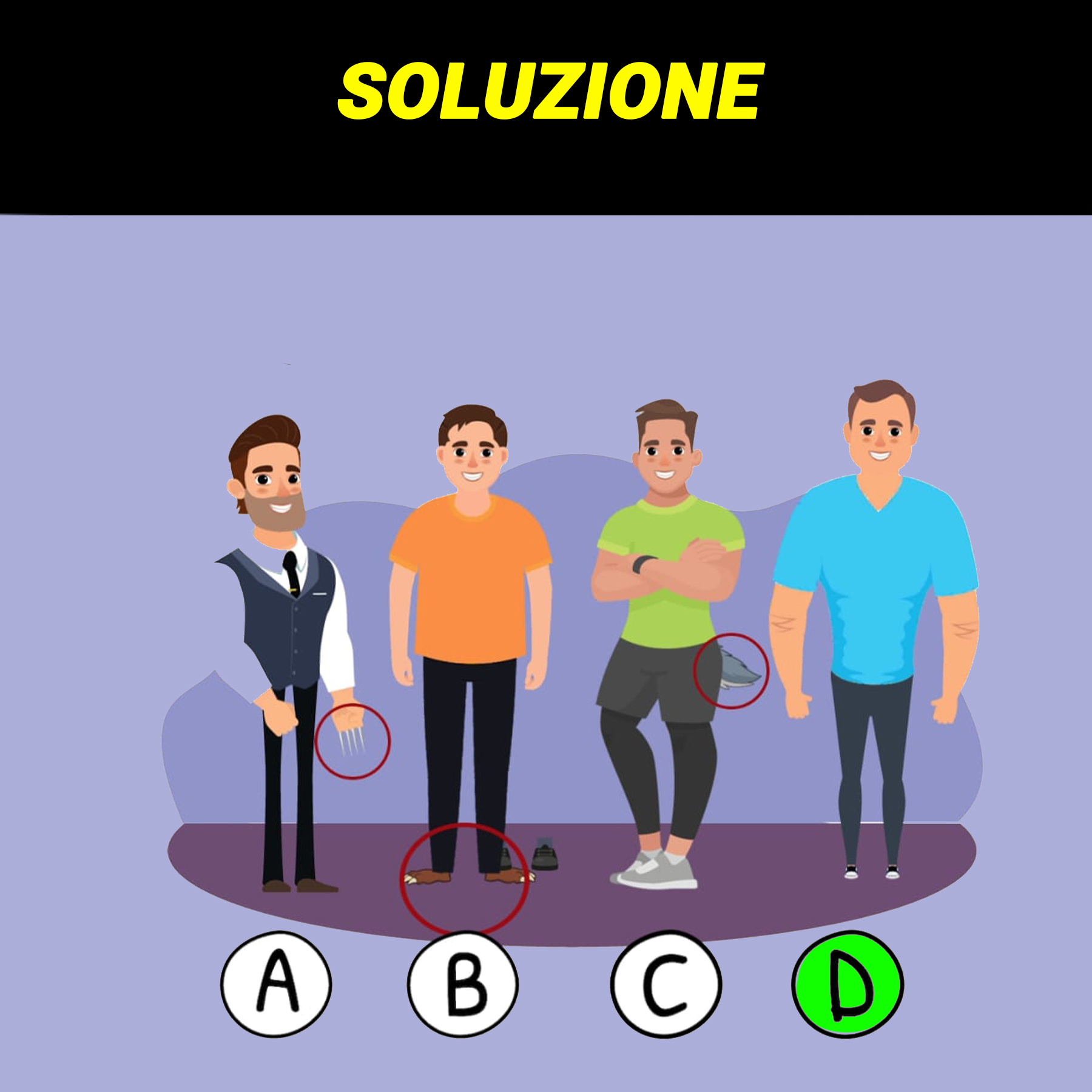 Ad esempio, prendiamo in considerazione l’uomo “C”, osservando la sua tenuta da allenamento i più attenti avranno notato fin da subito un’inquietante coda da lupo uscire dai pantaloncini. L’uomo “B” d’altro canto ha dei piedi, se così possiamo chiamarli, davvero caratteristici… Restano in gioco solamente due uomini.