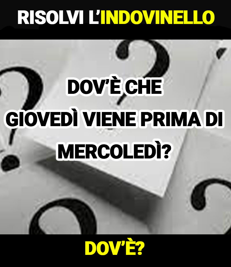 Bentornati o benvenuti su Aforismi.it, la vostra pagina online, sulla quale ogni giorno potrete trovare quiz, test ed enigmi di tutto punto, per mettere alla prova le vostre capacità di ragionamento logico. L’indovinello di oggi narra questo: “Dov’è che giovedì viene prima di mercoledì?”. Riesci a rispondere?